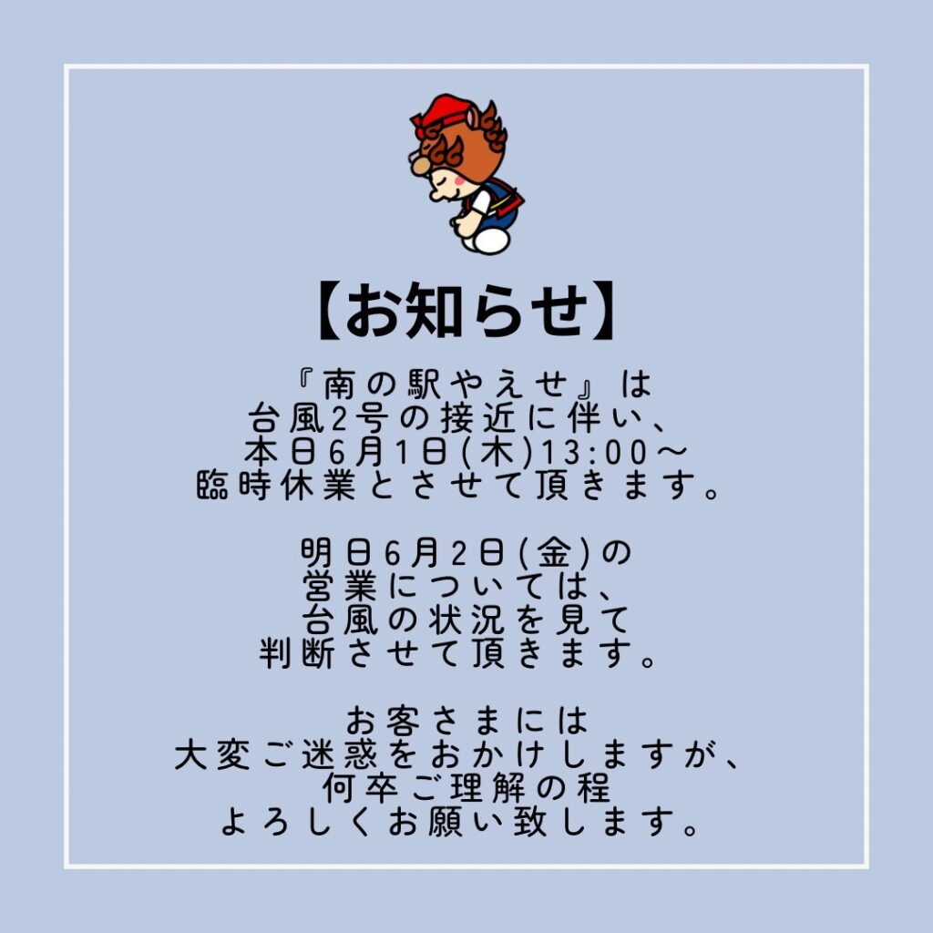 『南の駅やえせ』は台風2号の接近に伴い、本日6月1日(木)13:00〜臨時休業とさせて頂きます。