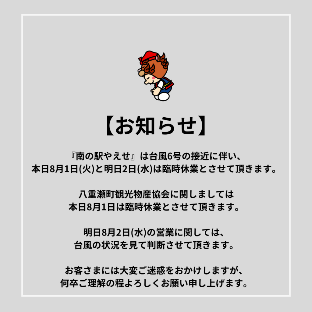 『南の駅やえせ』は台風6号の接近に伴い、本日8月1日(火)と明日2日(水)は臨時休業とさせて頂きます。