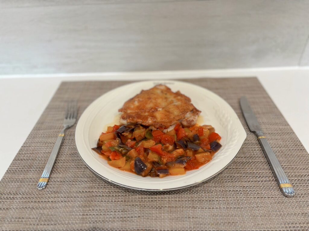 「夏野菜のテリーヌと鶏モモ肉のパリパリソテー」