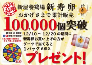 おかげさまで南の駅やえせで大好評の「新寿卵」が累計販売100,000個突破を記念して 12/10~12/20までの期間「新寿卵」を購入の方に簡単ダーツであたりを当てると 「新寿卵6個パック」をプレゼント!数量限定ですので […]