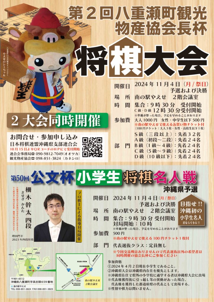 参加料には「南の駅やえせ」で使えるクーポンが付いていますので、会場でのお食事・お買い物をぜひお楽しみください。多くの将棋ファンの参加をお待ちしております。