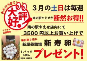 令和6年3月は毎週土曜日曜がお買い得に! 南の駅やえせで3500円以上お買い物すると 大人気「新寿卵」6個パックを1個プレゼント! 先着20名様となりますのでお早めに!