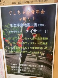 下記イベントは雨天の為延期となりました。 具志頭青年会による能登半島地震チャリティーエイサーを 3月31日 1回目13時~ 2回目15時~公演を行います 活動の趣旨をご理解いただき皆様のご協力お願いします。